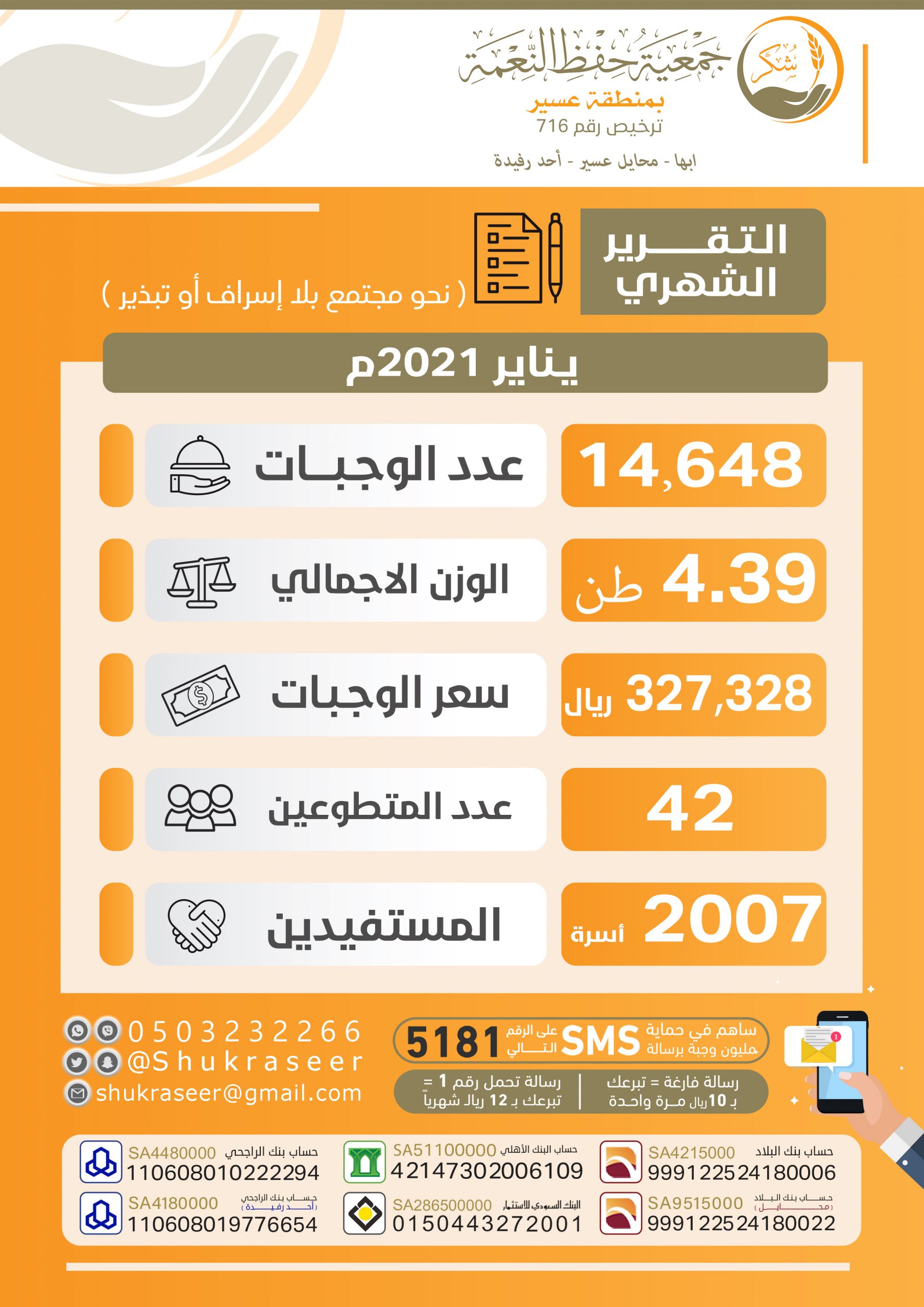وكان لدعمكم بالغ الأثر في حفظ ( 14,648 وجبة ) من الأكل الصالح وزعت على (2007 أسرة) من مستفيدي الجمعية خلال شهر يناير لعام 2021م .
